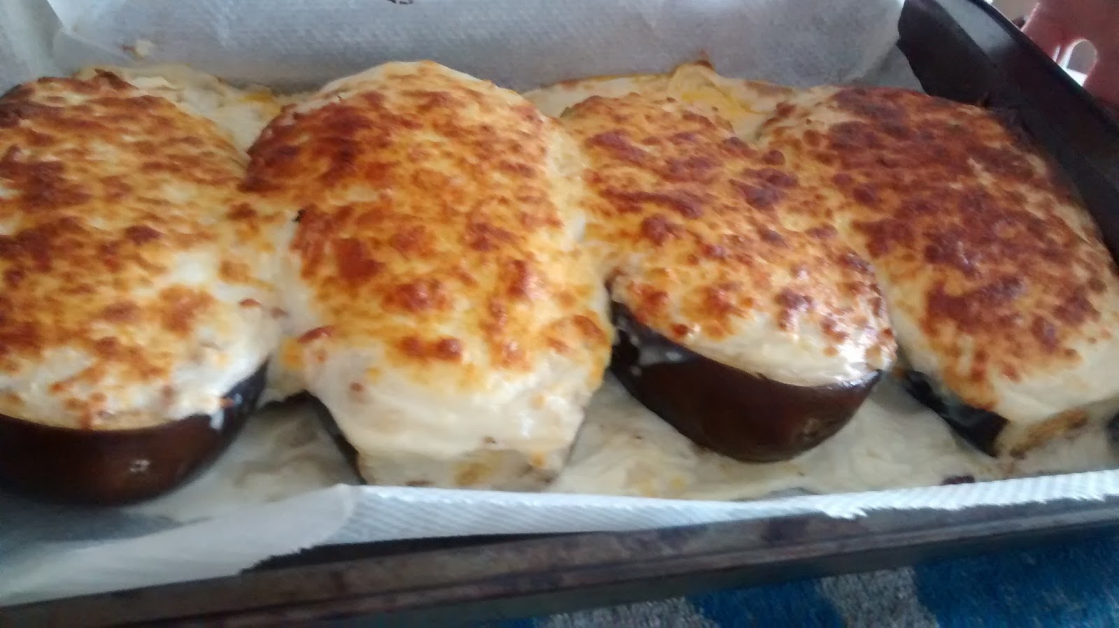 - Sacamos las berenjenas del horno y las rellenamos con la mezcla de carne y vertimos sobre ellas la salsa de bechamel y el queso rallado
