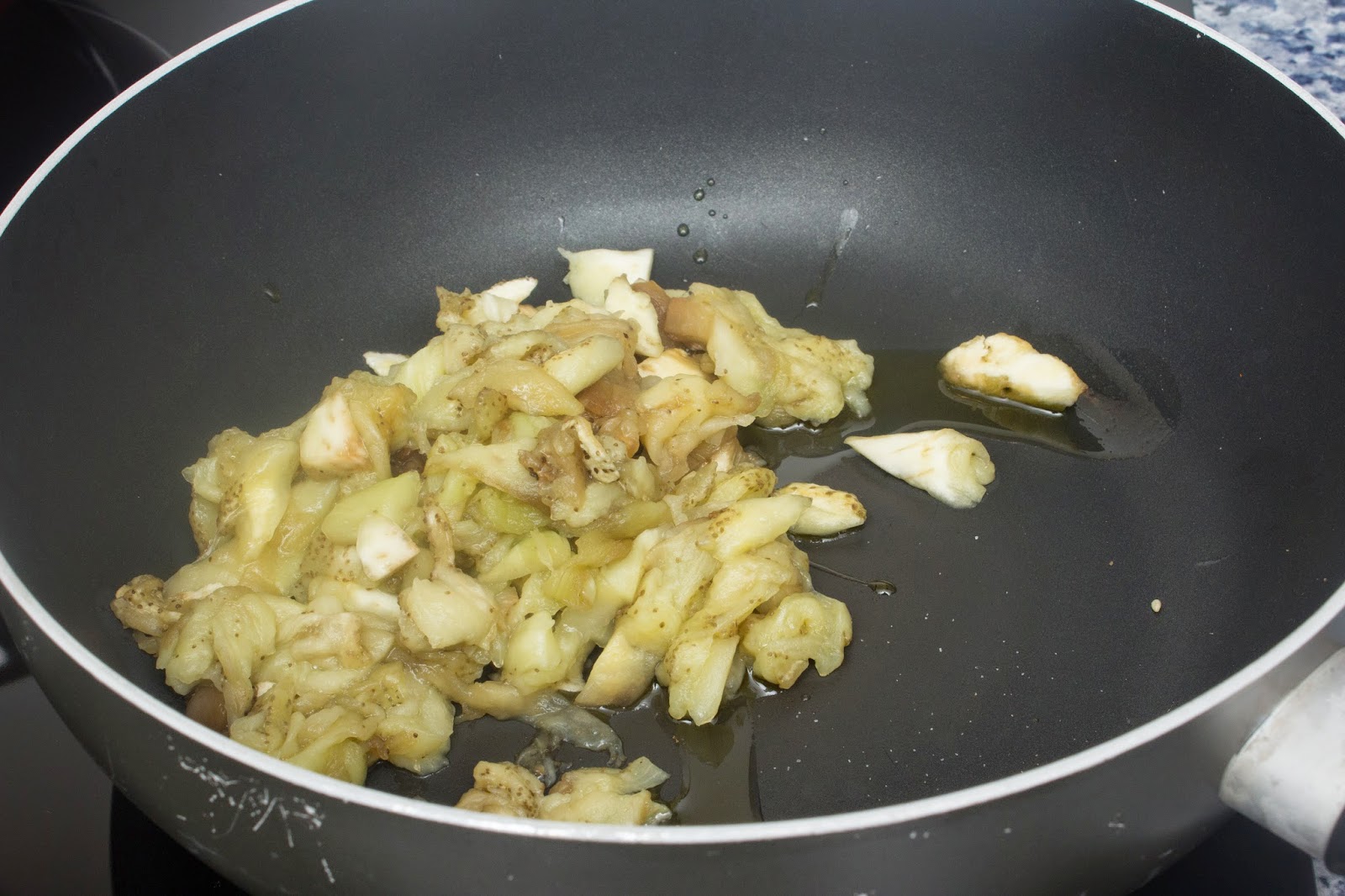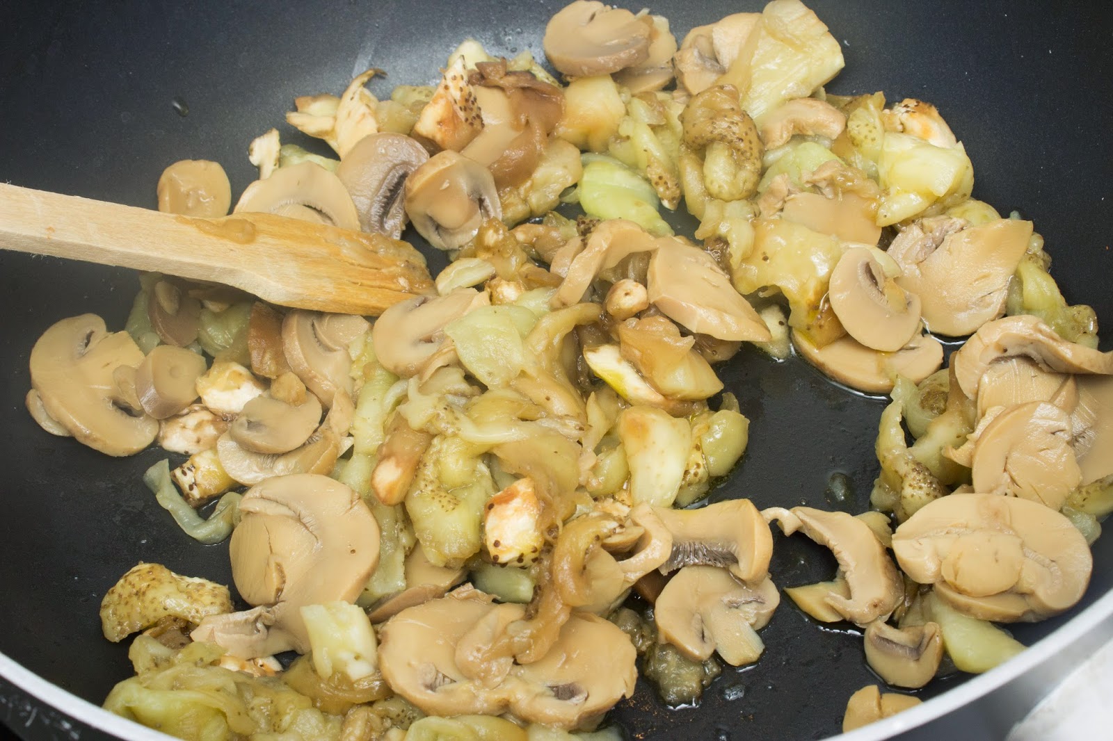 Luego añade los champiñones laminados después de darle unas vueltas. Deja que se rehoguen y se hagan un poquito ambos ingredientes