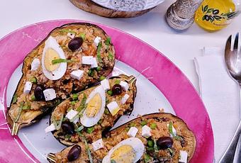 Para hoy tengo un fabuloso primer plato de berenjenas rellenas de cuscús (cous cous) con verduras ,olivas negras, queso y huevo cocido.Las berenjenas rellenas son un clásico de la cocina internacional, se pueden rellenar de mil y unas maneras; con huevo, ropavieja, merluza o con champiñones.