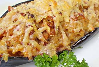 Lavar, partir las berenjenas por la mitad a lo largo y sacar la pulpa, para ello hacer un leve corte alrededor y otros en el centro para facilitar el vaciado con una cucharilla.