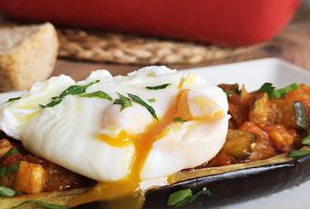 Elaboración de las berenjenas rellenas de pisto con huevo poché