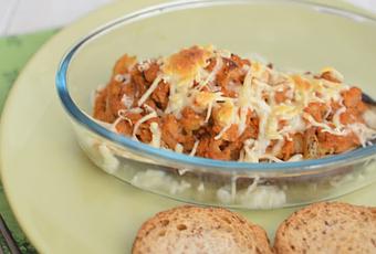 Retiramos del fuego y rellenamos las berenjenas con la mezcla. Cubrimos con queso rallado light. Llevamos al horno y gratinamos unos minutos.