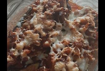 Cortar las berenjenas por la mitad, hacer unos cortes, sazonar con sal y pimienta las berenjenas, rociarlas con de aceite, colocarlas bocabajo en una bandeja de horno y asarlas 15-20 minutos a 180ºC. Retirar, vaciar y reservar. También se pueden hacer en el micro 5 minutos a máxima potencia.