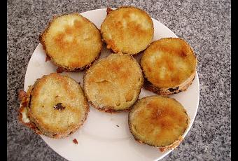 Elaboración:1. Cortamos la berenjena en rodajas y cogemos 12 rodaja (Que tenga el mismo diámetro una con otra, irán en pareja de dos).2. En 6 de las 12 rodajas de berenjena le pondremos jamón de york y queso por encima. Las taparemos con las otras rodajas.3. Pondremos a calentar una sartén con abundante aceite. 4. Cuando el aceite este bastante caliente pararemos las berenjenas por huevo batido y pan rallado. La echaremos en la sartén la dejamos friendo hasta que el pan rallado se dore.