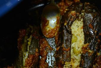 Rellena las berenjenas y los calabacines, con la mezcla anterior de carne (si lo quieres hacer vegetariano hazlo sin la carne que igual queda delicioso) y arroz, sin presionar el relleno en el interior.Golpea ligeramente la base para que el arroz aumente de tamaño durante la cocción, por eso debes rellenar pero dejando espacio.