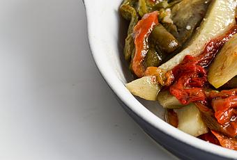 MODO DE HACER 1. Ponemos en una fuente los pimientos untados en aceite. 2. Untamos también las berenjenas con aceite y las envolvemos en papel de aluminio colocándolas con los pimientos en la fuente resistente al horno. 3. Lo metemos al horno precalentado a 180ºC durante unos 30-45 minutos o hasta que estén hechos. A mitad de tiempo conviene darles la vuelta. 4. Cuando estén hechos se sacan y se meten los pimientos en una bolsa de plástico para que suden y poder pelarlos mejor y se dejan enfriar junto con la berenjena a la que no le quitamos el papel. 5. Cuando están frios pelamos los pimientos y las berenjenas y lo cortamos todo en tiras. 6. Se disponen las tiras sobre una fuente se salan y se aliñan con un poco de aceite y por encima se les pone un diente o dos de ajo muy picaditos.