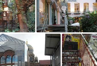 Subimos luego hasta el antiguo Mercado de Hackescher, la vieja plaza de ladrillo rojo reconvertida en estación de metro, centro cultural y zona de ambiente, con sus terrazas, sus pequeños teatros y sus mercadillos callejeros, alrededor de la cual se extiende una amplia red de calles y avenidas comerciales, cuyo eje principal gravita entre las calles Rosenthaler y Sophienstrasse, destacando el conjunto de patios conocido como Hackescher Hofe, un grupo de edificios modernistas que fueron vivienda, oficina o taller, hoy bellamente rehabilitados y unidos entre sí por pasadizos y placitas llenos de encanto, con arcos, patios ajardinados, fuentes, azulejos, exquisito mobiliario urbano y locales de nuevo diseño de todo tipo: tiendas, galerías, bares, restaurantes…no aptos para todos los bolsillos.