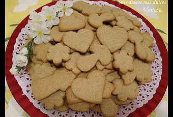 Poner 3 cucharadas de miel con las especias: 1 pellizquito de canela molida, y de jengibre en polvo en una cacerola al fuego hasta que empiece a hervir.Añadir 3 cucharadas de agua y dejar enfriar.Tamizar 300 gr de harina encima del mármol, hacer un volcán y poner en el centro 30 gr de manteca ablandada, 100 gr de azúcar, la miel y 1 huevo.Deshacer 1 cucharadita de café de bicarbonato con el agua restante y mezclar todo hasta obtener una masa homogénea.Envolverla en papel film y dejar reposar en la heladera unos 30 minutos.Estirar la masa con el rodillo pastelero y con un corta-pastas las galletas.Ponerlas encima de una fuente enharinada, pintarlas con yema de huevo batida con unas gotas de caramelo líquido y al horno caliente de 12 a 15 minutos, hasta que estén doradas.Guardadas en caja metálica ser conservan perfectamente.