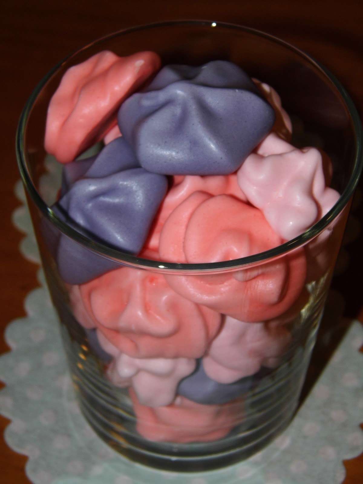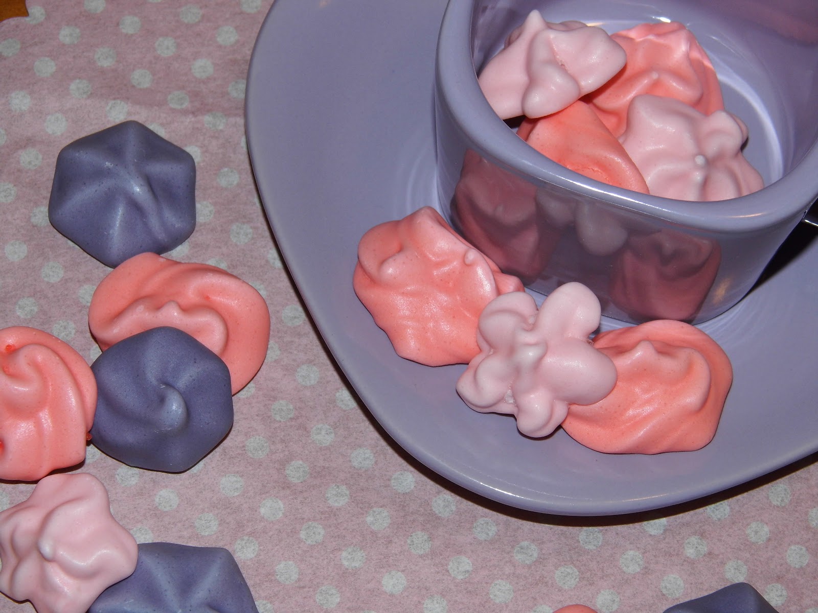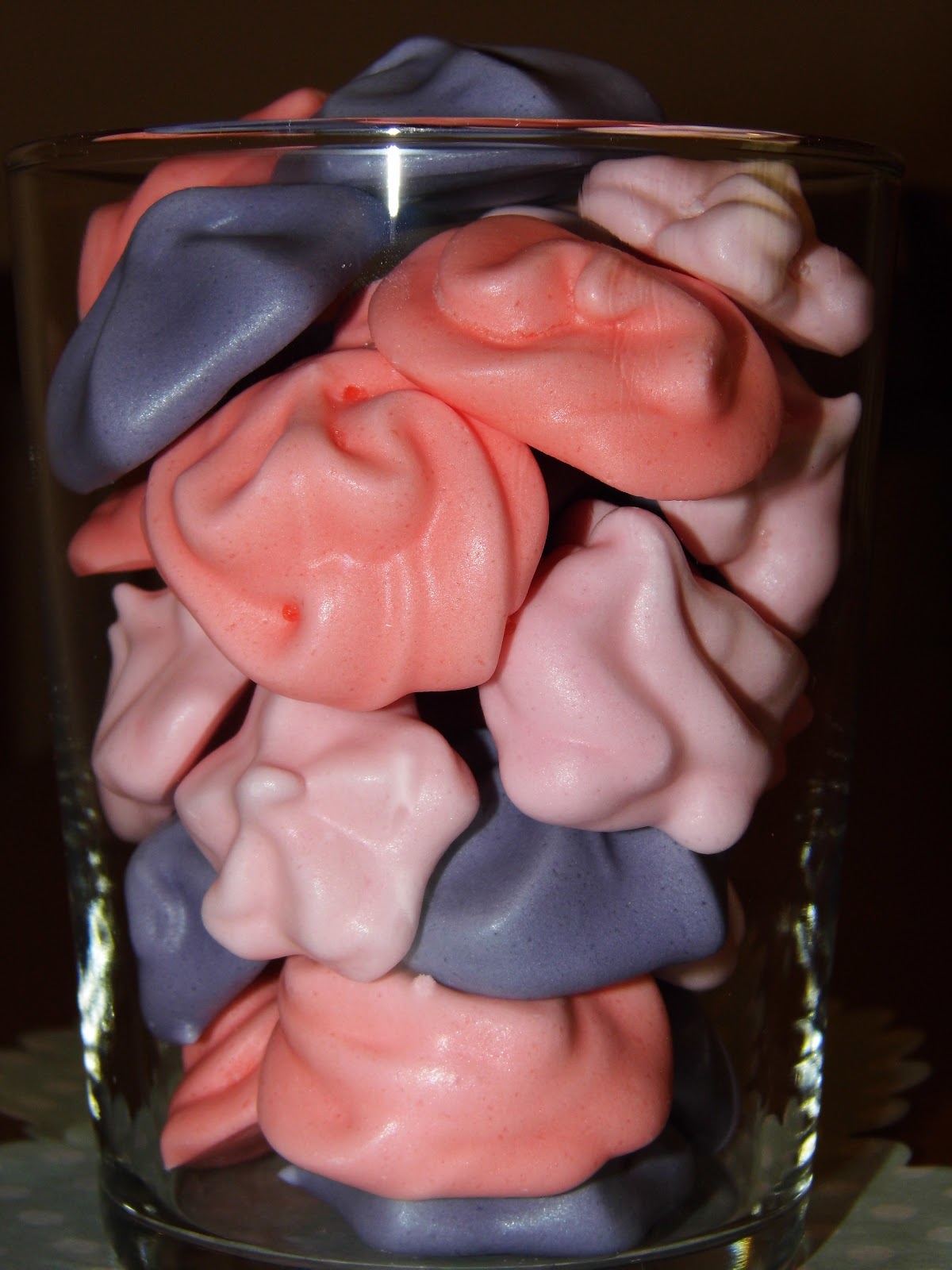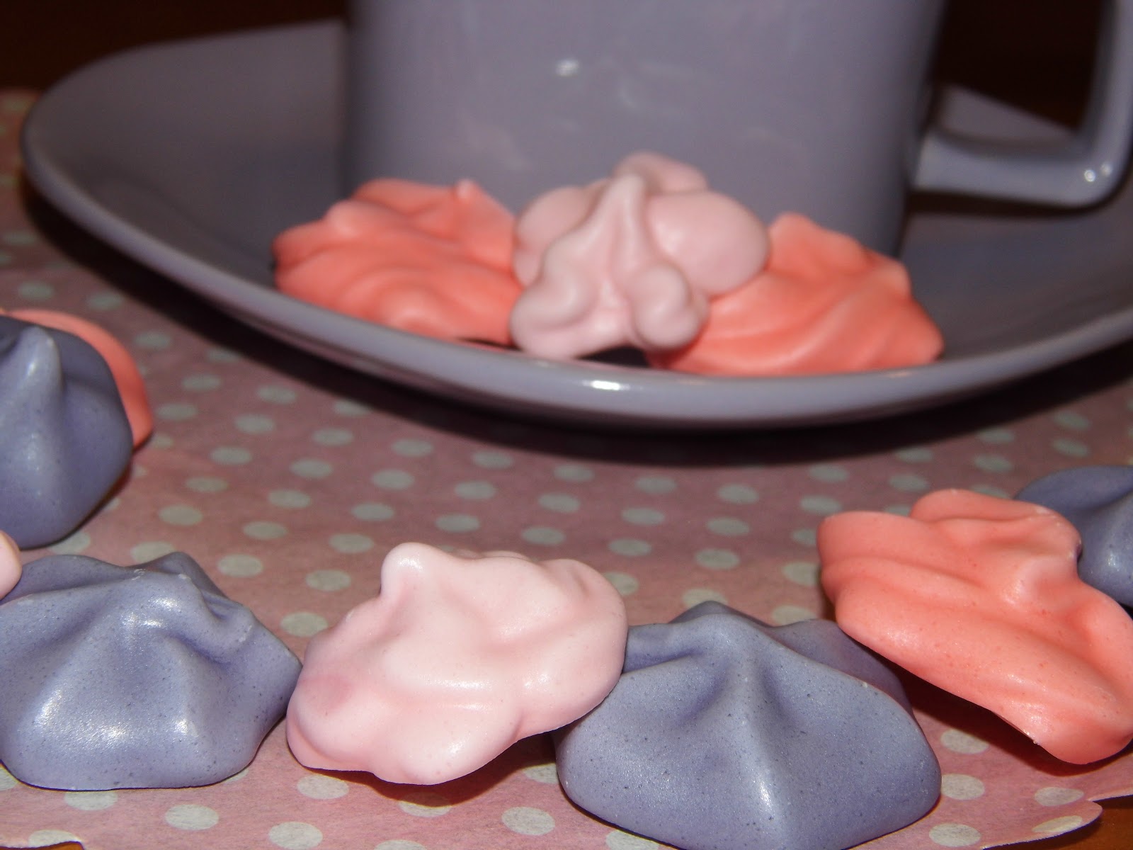 Ingredientes: 100gr de claras de huevo (De tres huevos grandes) una pizca de sal 100gr de azúcar 100gr de azúcar fino tipo glass tamizado Colorante en pasta (Morado, Rosa, rojo) Precalentamos el horno a 80º En un bol o tmx echamos las claras con la pizca de sal y las montamos, si no se tiene tmx utilizar las varillas Cuando estén a punto de nieve seguir batiendo añadiendo poco a poco el azúcar normal, debe queda brillante. Ahora en un bol y una espátula de silicona mezclamos el azúcar glass en movimientos envolventes, poco a poco no todo a la vez. Cuando esté todo bien integrado separamos en tres partes y las coloreamos con los colores elegidos. Metemos cada masa en una manga preparada con boquilla de estrella. En una placa de horno con papel de hornear vamos haciendo montoncitos. Metemos al horno 3 horas a 80º, deben quedar secos.