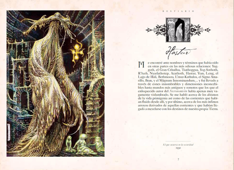 Bestiario y, como indica tan acertado título, es una recopilación de criaturas imposibles, espantosas, de las que uno sólo espera encontrarse en sus peores pesadillas. La descripción de cada criatura se realiza a través de fragmentos de los libros de Lovecraft, al final de los mismos, se indica de qué obra se ha extraído y su fecha de publicación.