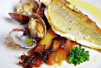 Emplatar colocando la manzana caramelizada con las almejas y el filete de besugo.