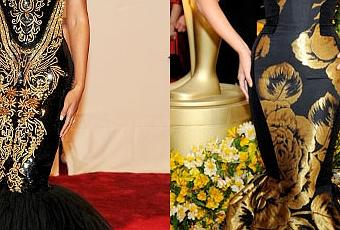 Photographers booed and yelled after she posed too quickly for their liking and then tried to make it the rest of the way up the stairs, probably not to disgruntle the photographers but simply because if she had to fall she didn't want to fall in front of all of them.I had a Déjà Vu sense, and it's because the Pucci dress was so similar to the House of Deréon's dress that she wore at 81 Oscar Edition in 2009.What do you think about the diva's Black-and-gold fishtails obsession?