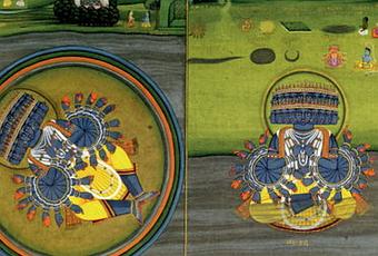 VISHVARUPA, LA FORMA CÓSMICA DEL DIOS VISHNU. ca 1840. Escuela de Rajastán, Jaipur, Gouache y oro sobre papel.