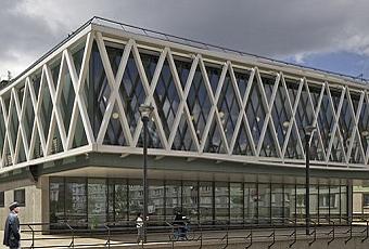 La estructura de vigas perimetrales compuestas por una malla metálica diagonal le confiere al edificio una gran fuerza expresiva, al tiempo que permite un dialogo visual límpido y continuo. Las fachadas de vidrio separadas de la estructura metálica por una calle de mantenimiento, permiten dar profundidad a la fachada. El tratamiento del parque, cubierto de vegetación sobre una superficie ondulada es determinante para la caracterización de un ambiente plácido y agradable a la sala de lectura, prolongado en el techo parquizado, que tiene el mismo tratamiento que el parque.