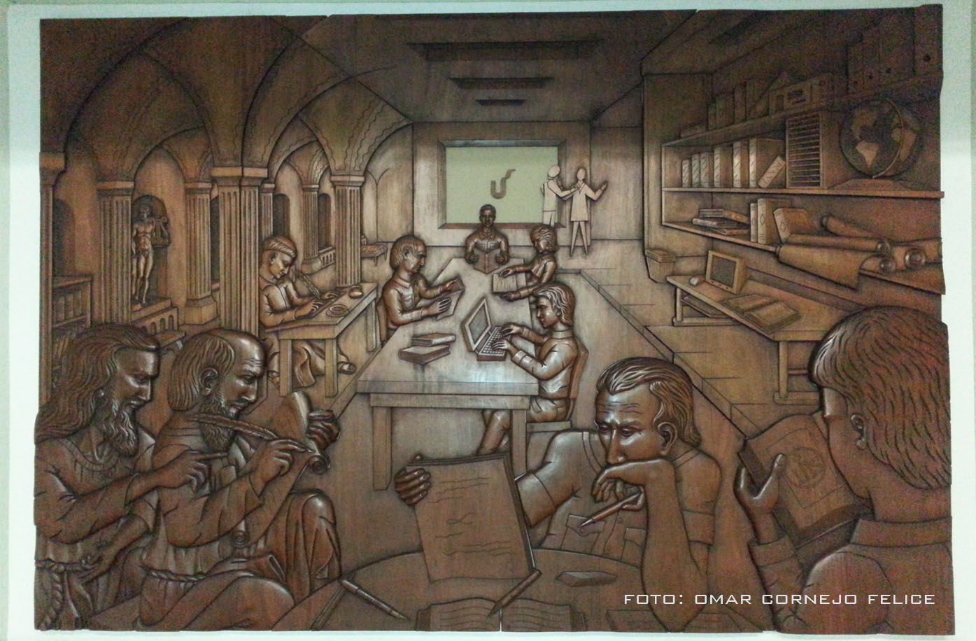panel tallado en madera, titulado “Saber”, obra del escultor y ingeniero