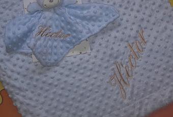 Hola chicas, buenos días. Ayer fue un día intenso, y no tuve ni un minuto para pasar por aquí. Pero hoy, a pesar de que el día promete, he logrado buscar un huequito. Hoy os traigo un regalito que preparé para darle la bienvenida a un bebé, familia de mi marido, que iba a llegar a principios de Diciembre pero que decidió sorprendernos adelantándose. Esta mantita personalizada, calentita, mullidita y muy tierna y este doudou, que se convertirá en su inseparable amigo. Bienvenido Héctor y felicidades a los papás. Buen Miércoles.