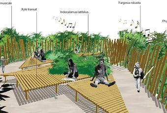 El jardín está rodeado por una valla que es en realidad se trata de un pentagrama musical. Al variar la longitud de cañas de bambú y su separación se modifica su capacidad de resonancia, la valla invitará gente a interpretar una pieza musical mientras pasea .