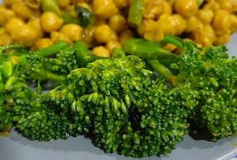 Cuando esté caliente añade los garbanzos y los tallos de bimi cortados a trocitos. Añade todas las especies y deja rehogar durante 5-6 minutos.