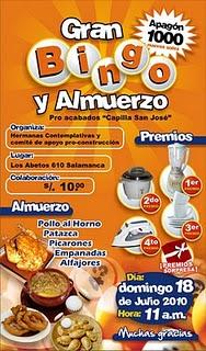 Señor José Antonio Benito Nos da mucha alegría poder saludarlo. Como le comentaba, estamos realizando un Bingo Pro Capilla "San José" para el día 18 del presente. Por lo cual le rogamos su colaboración, en hacer publicidad de nuestra actividad, ya que es para continuar con los acabados de nuestra Capilla "San José". Le agradecemos de todo corazón, y rogamos al Señor que lo siga bendiciendo en la labor que Ud. desempeña Atentamente Hnas Contemplativas del Buen Pastor.