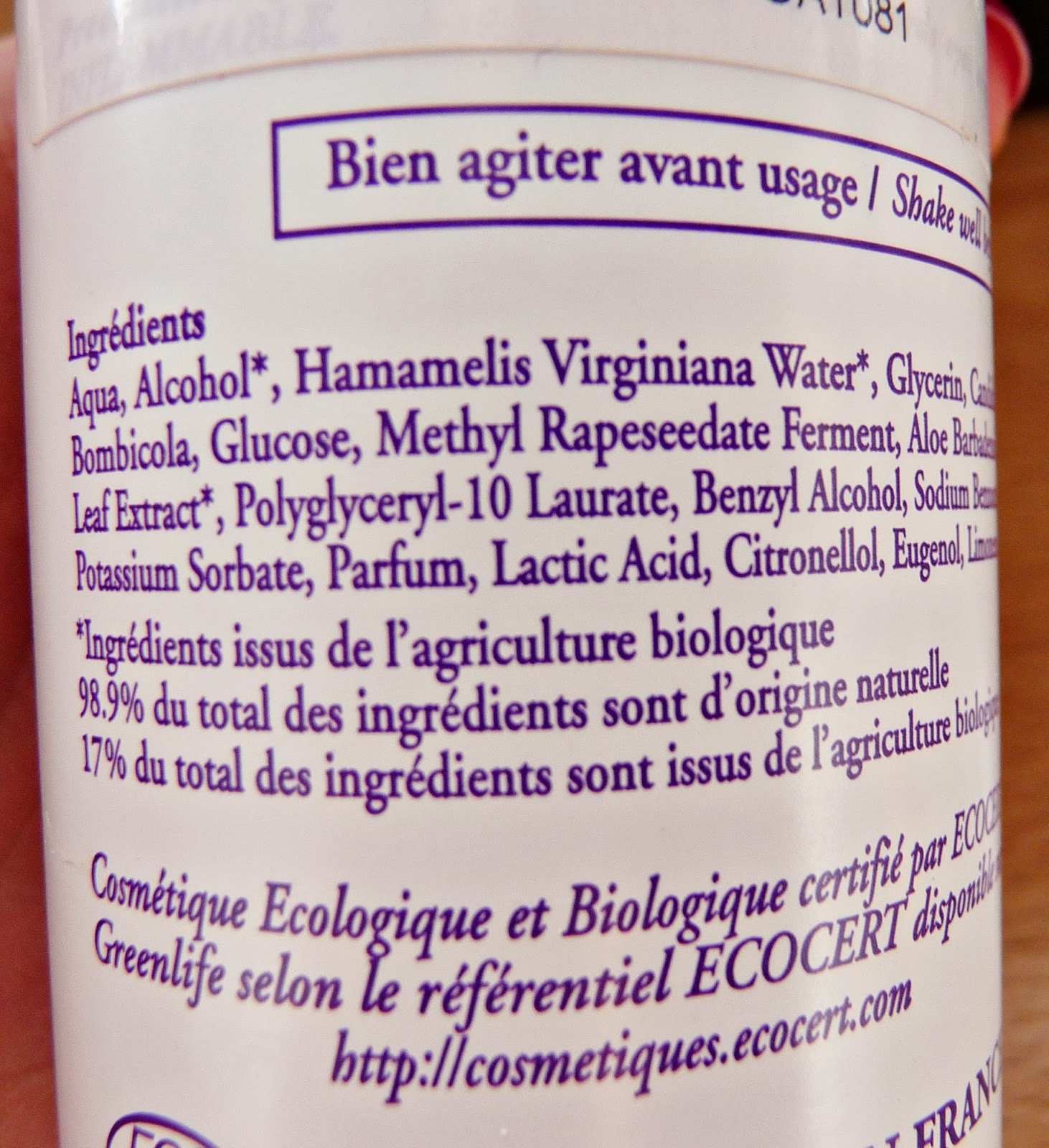 * Positiva:- Composición muy natural: -- Agua Floral de Hamamelis Bio: calmante, descongestionante, anti-inflamatorio, estimula la circulación -- Aloe Vera: anti-inflamatorio, calmante, hidratante, protector -- Agente antibacteriano natural.- Me encanta como producto :-)