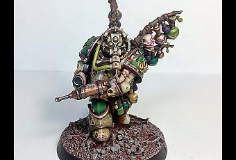 Utilicé barniz brillante por las heridas abiertas y mucosidades de toda la armadura, lo viales los dejé mate, ya que considero que este adorador de Nurgle no se preocupará en quitarle el polvo a los tarros y pociones que lleva encima.