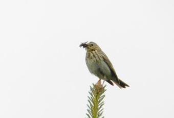 Hay ciertas zonas de contacto de ambas especies, sobre todo en los pinares de mediana altitud, las fotos anteriores las tomé una muy cerca de otra. El bisbita arbóreo no suele subir por encima de los 800 m, y el alpino no suele bajar de los 600, y es en esa franja de 600-800 m donde ambas se encuentran. Pero sus hábitats son diferentes, al arbóreo le gusta más la campiña y al alpino los espacios abiertos y rocosos. También se pueden ver algunos ejemplares con ceba en el pico.