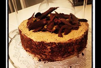 Cortamos en tres láminas nuestro bizcocho de huevo. Empapamos cada una de las láminas con nuestros sirope y luego rellenamos con la crema de Moca. Cuando ya tengamos toda la tarta rellena y empapada en Sirope, procedemos a la decoración. Yo simplemente me decantado por una decoración sencilla basada en un alisamiento de la crema por el exterior de la tarta y decorándola con un poco de chocolate derretido, enfriado y cortado y rallado en láminas.