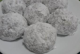 4. Cuire au four pendant 15-20 minutes. Sortir les biscuits du four et les laisser refroidir pendant 4-5 minutes. Pendant que les biscuits sont encore tièdes, les rouler soigneusement dans le sucre glace. Quand ils sont refroidis, les rouler à nouveau pour une deuxième fois (ou une troisième fois) et les laisser refroidir complètement sur une grille. Garder les biscuits dans une boîte en métal, séparés par du papier parchemin.