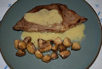 4 bistec de ternera de 175 gr cada uno40 gr de mantequilla20 gr de harina1 vaso de caldo de carne1 cucharada de mostaza250 gr de champiñonespimienta blanca recién molidaaceite y salPreparación: