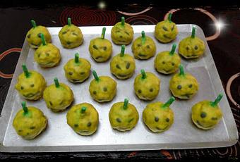 Cuando este todo seco. Mezcla un poco de glasa verde con colorante rojo, así obtendrás una glasa marrón. Dibujale con ella, caritas con diferentes gestos. Resultarán unas calabacitas graciosas. A los niños les encantarán.