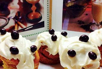 Hoy para desayunar retomamos la calabaza. Bizcochitos cubiertos de frosting de crema de queso y conguitos, ideales para estas fiestas si tenemos niños en casa, en edades comprendidas entre 0 a 110 años, teniendo en cuenta que en los recién nacidos la ingesta de los mismos se realiza de forma indirecta, es decir se lo come la madre y cuando la criatura tire de pecho ya veréis como os paga con un “eructito” impresionante.