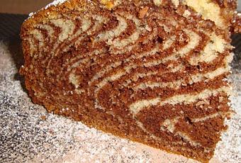 Untar el molde con mantequilla y espolvorear de harina, sacudir el sobrante de harina, iremos echando la pasta de forma alternativa, primero un cazo de la mezcla blanca justo en el centro del molde, luego otro cazo de mezcla de chocolate justo en el centro de la anterior y así sucesivamente hasta terminar las dos mezclas.