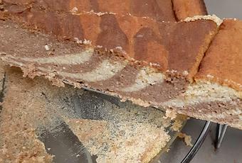 Añadir el cacao a la mitad de la masa y triturar de nuevo y la ralladura de limón a la otra mitad. Luego verter con cuidado en el centro del molde la masa. Ir poniendo alternativamente capas de cada masa.