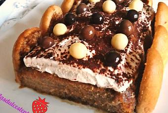 Un bizcocho casero húmedo, con un delicioso sabor a café, con nata y cacao, adornado con unos bizcochos de soletilla. Rico...rico..!!!
