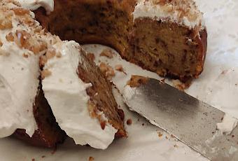 Colocar el bizcocho en la base, verter frosting por encima y decorar con harina de nueces. Conservarla en nevera. A la hora de consumirla, sacarla 20 minutos antes.
