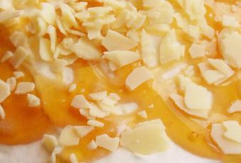 - Decoramos la superficie con nata montada y esparcimos con una cuchara la miel por encima dando un toque final con chocolate blanco.