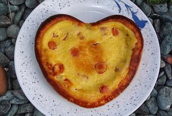 Ingredientes:- 40 gramos de harina de reposterías.- 15 cerezas.- 20 gramos de mantequilla.- 8 gramos de azúcar avainillado.- 15 gramos de almendra molida.- 3 huevos medianos.- 40 gramos de azúcar.- 150 mililitros de nata para postres.- 50 mililitros de leche.