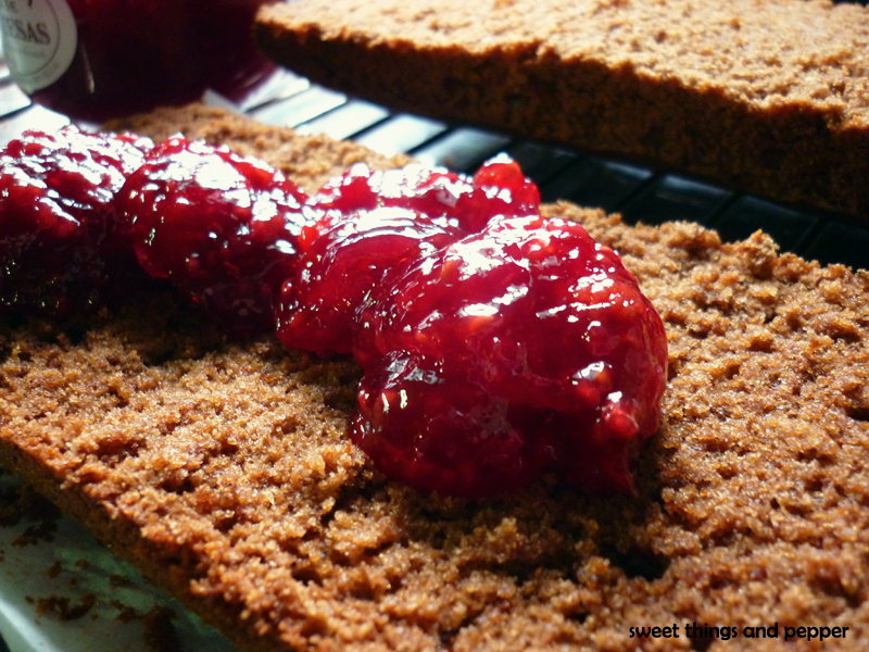 Ahora unimos las dos mitades,y echamos un poco de mermelada por la parte de arriba del bizcocho.Extendemos bien.