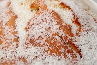 Una vez listo untamos toda la superficie con mantequilla y espolvoreamos coco rallado, con el bizcocho caliente. Dejamos enfriar y a la mesa!