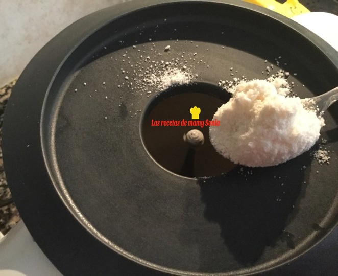 Mezclamos los ingredientes secos, harina, coco y levadura programamos