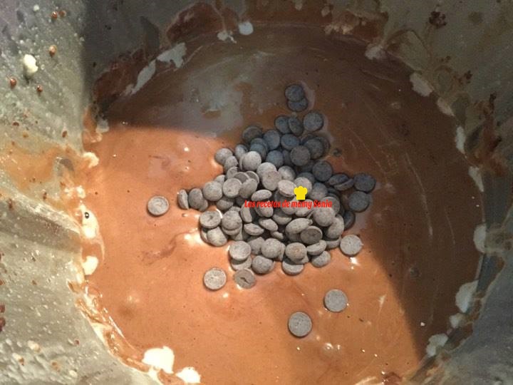 Añadimos el aceite y la leche y mezclamos unos segundos, agregamos la harina, el cola-cao y la levadura y mezclamos hasta que no queden grumos, a continuación incorporamos las perlas de chocolate y unimos todo.