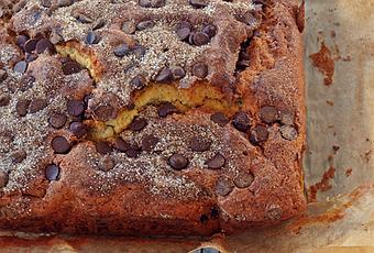 Vertemos la mitad de la masa en el molde engrasado y con papel, repartirnos la mitad de las chispas de chocolate y del azúcar de canela. Vertemos el resto de la masa y también el resto de chocolate y azúcar.