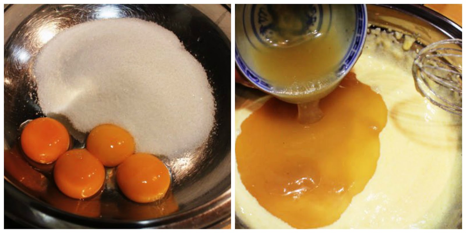 2.- Blanqueamos las yemas con el azúcar (este paso se puede hacer con las carillas de la batidora para que sea más rápido). Añadimos la crema de almendras y mezclamos bien (también con varillas).