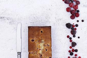 Ingredientes:- 4 huevos.- 200 g azúcar glass.- 200 g mantequilla pomada.- 260 g harina.- Una pizca de sal.- 2 cucharadas de miel.- 2 cucharadas de ron.- 1 cucharadita de levadura química.- 200 g de frutos rojos variados.