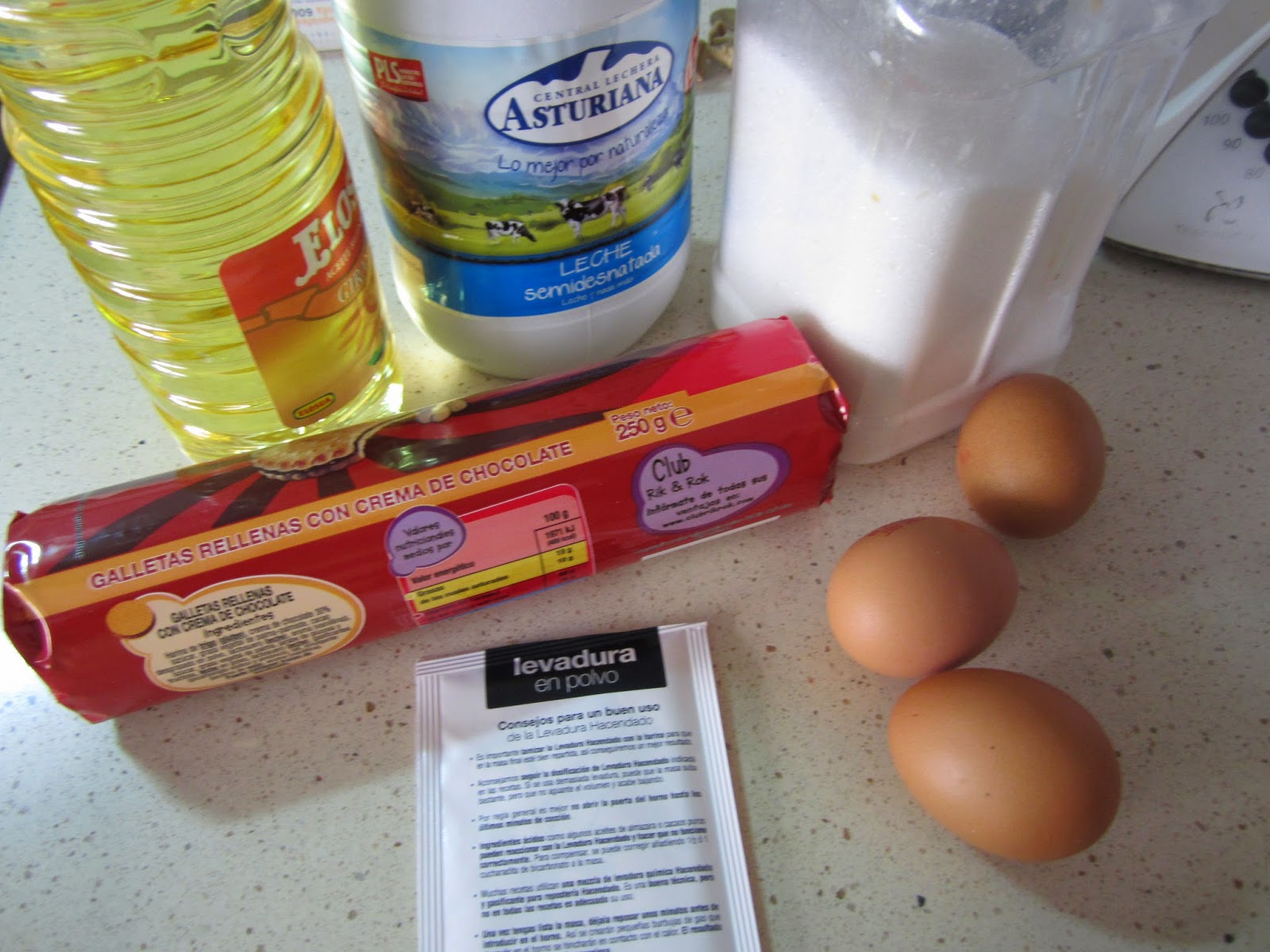 INGREDIENTES:- Un paquete de galletas rellenas de chocolate 250 gramos.-200 g de leche- 100 g de aceite de girasol- 3 huevos L-120 g de azúcar - 1 sobre de levadura.