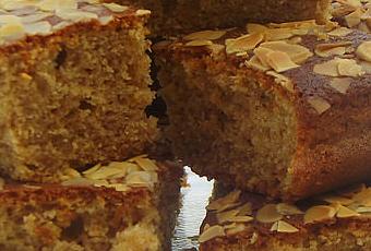 Untamos un molde rectangular de 22cm con un poco de aceite y cubrimos con papel vegetal. Introducimos la mezcla en el molde y alisamos la superficie. Espolvoreamos generosamente con la almendra fileteada y lo llevamos al horno a altura media durante 45 minutos.