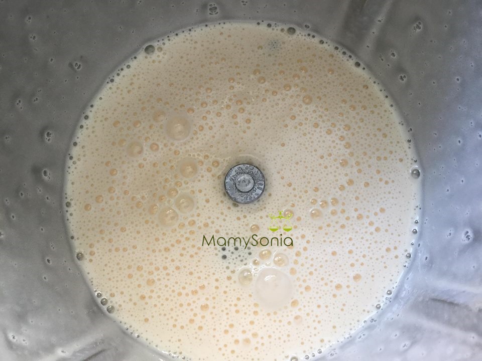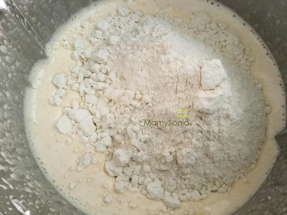 Añadimos el resto de ingredientes por el orden que os indico, la leche condensada, el aceite, el yogur, la levadura, la sal y la harina y mezclamos 20 Seg, Vel 6