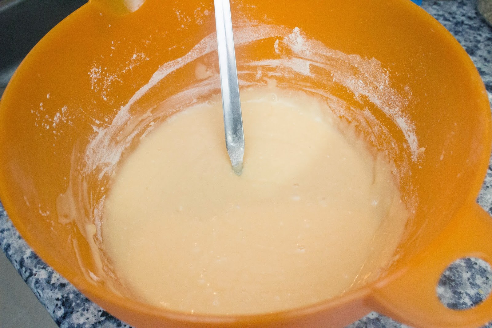 Echa el harina y lo mezclas bien. Puedes tamizarla primero para que quede mejor o si no bátelo muy bien.