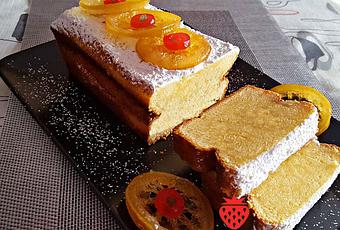 Cuando el bizcocho esté completamente frío desmoldar y espolvorear con azúcar glas, dejándola caer sobre un colador fino para que se distribuya de manera uniforme, decoramos con las rodajas de limón confitadas y las guindas.