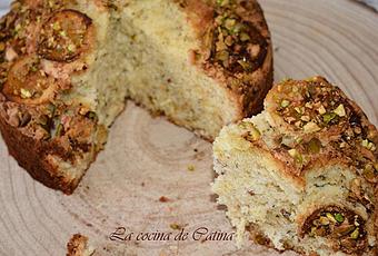 Vertemos la mezcla en el molde, colocamos las rodajas de lima y limón sobre la masa y esparcimos el resto de los pistachos por encima.